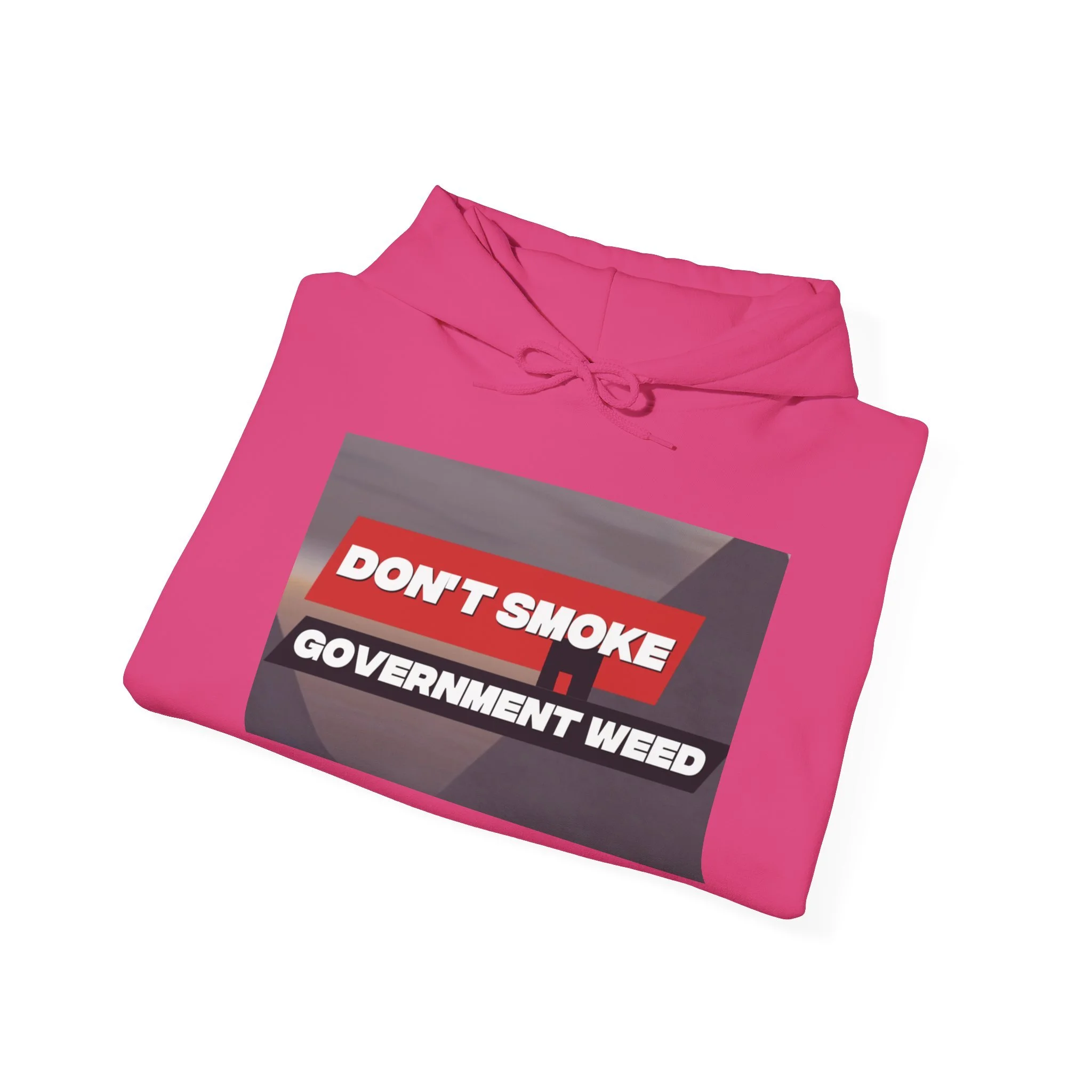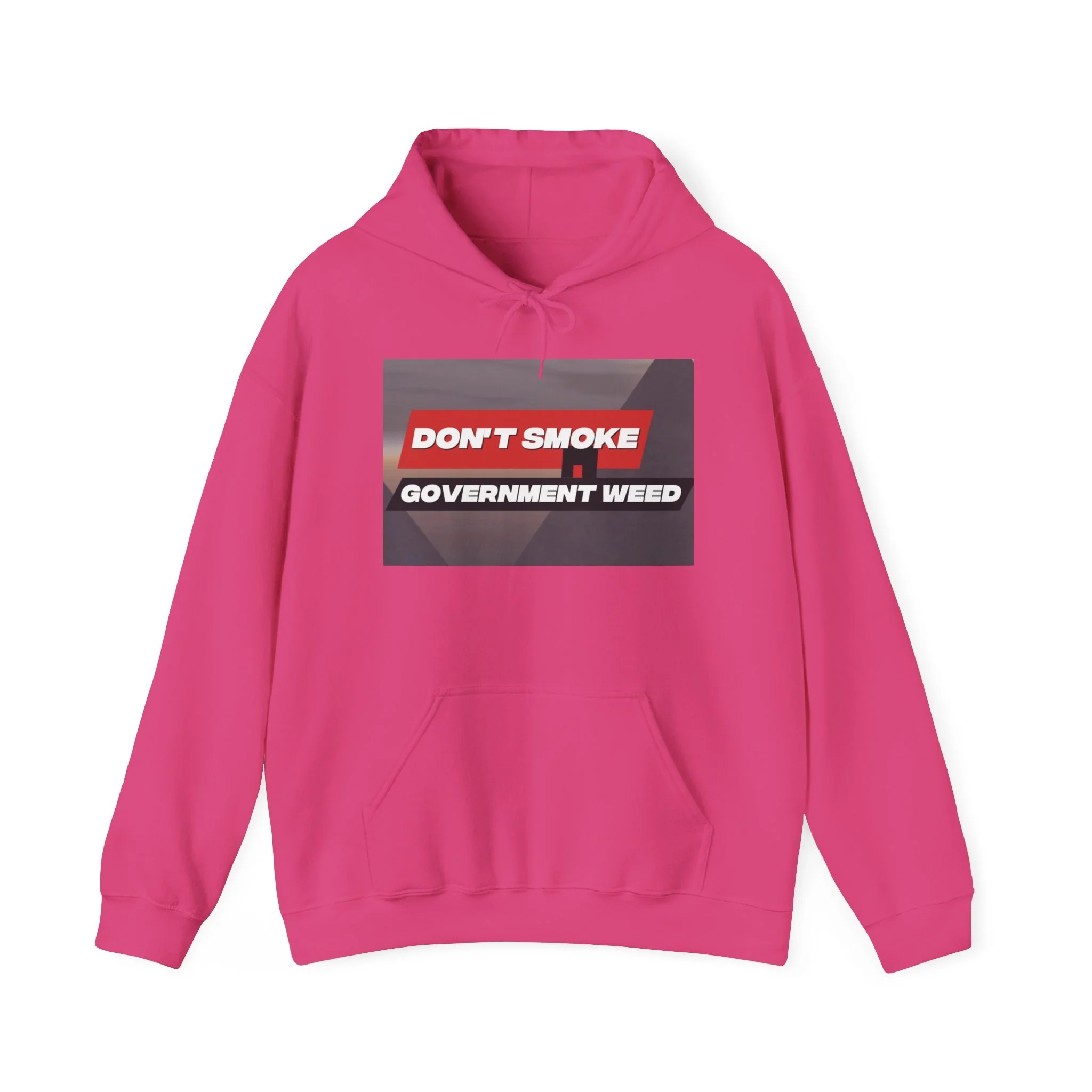 This midweight hooded sweatshirt brings a crisp, outspoken edge to casual days. The soft 50/50 cotton-poly fabric feels cozy against the skin while holding prints and embroidery with lasting clarity. A bold graphic across the chest reads "DON'T SMOKE / GOVERNMENT WEED," framed with a high-contrast red and black design that reads like streetwear commentary. The double-lined hood and matching drawcord add structure while the roomy kangaroo pocket keeps hands warm and holds small essentials. Subtle production details — tear-away label, tubular knit without side seams, and DTF/DTG-printed accents — make this hoodie comfortable, clean, and built to wear hard. Wear it to a rally, an outdoor hang, or when you want your stance to be heard without saying a word.