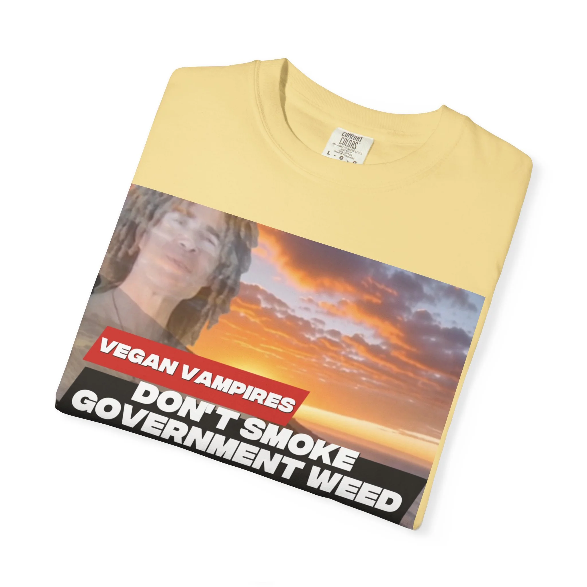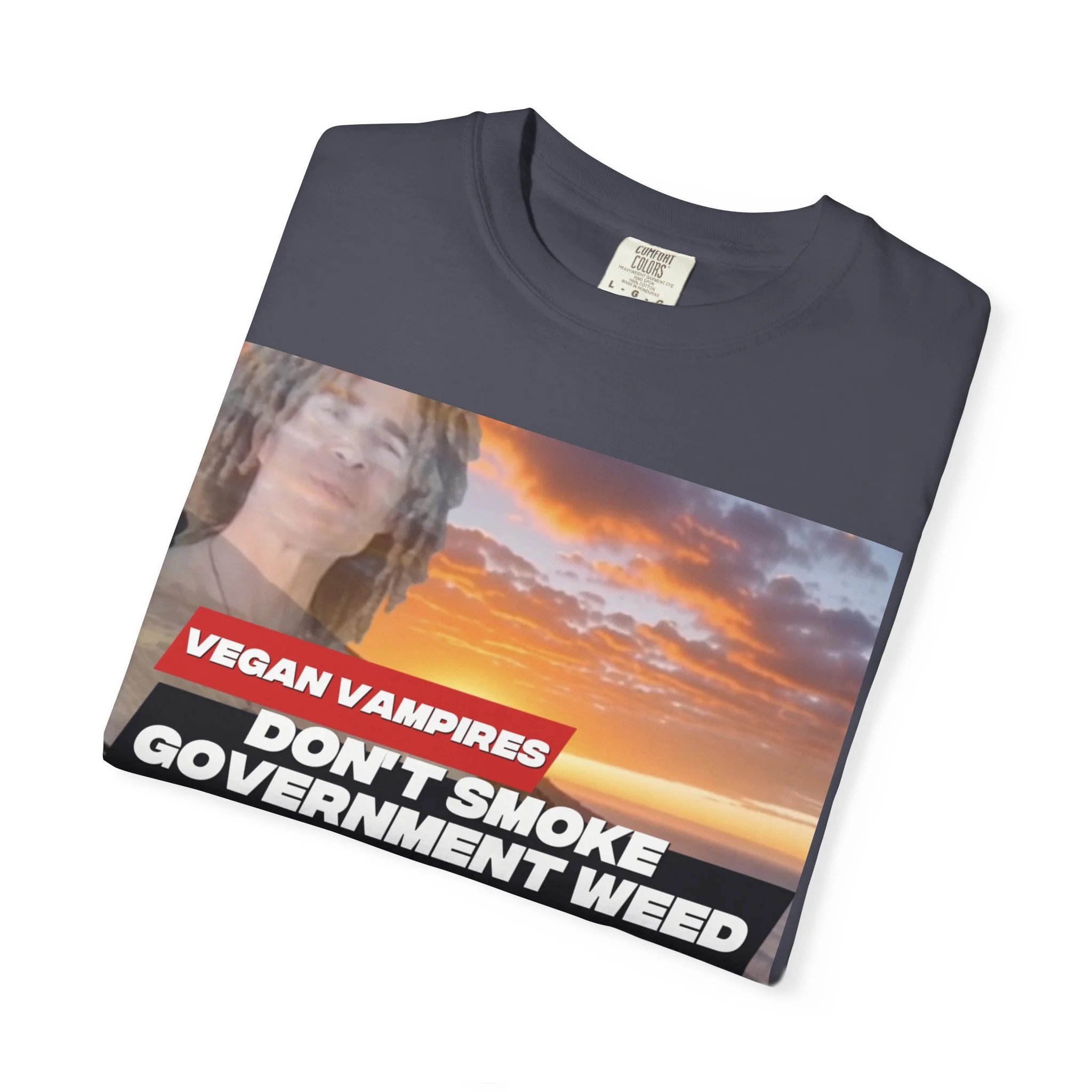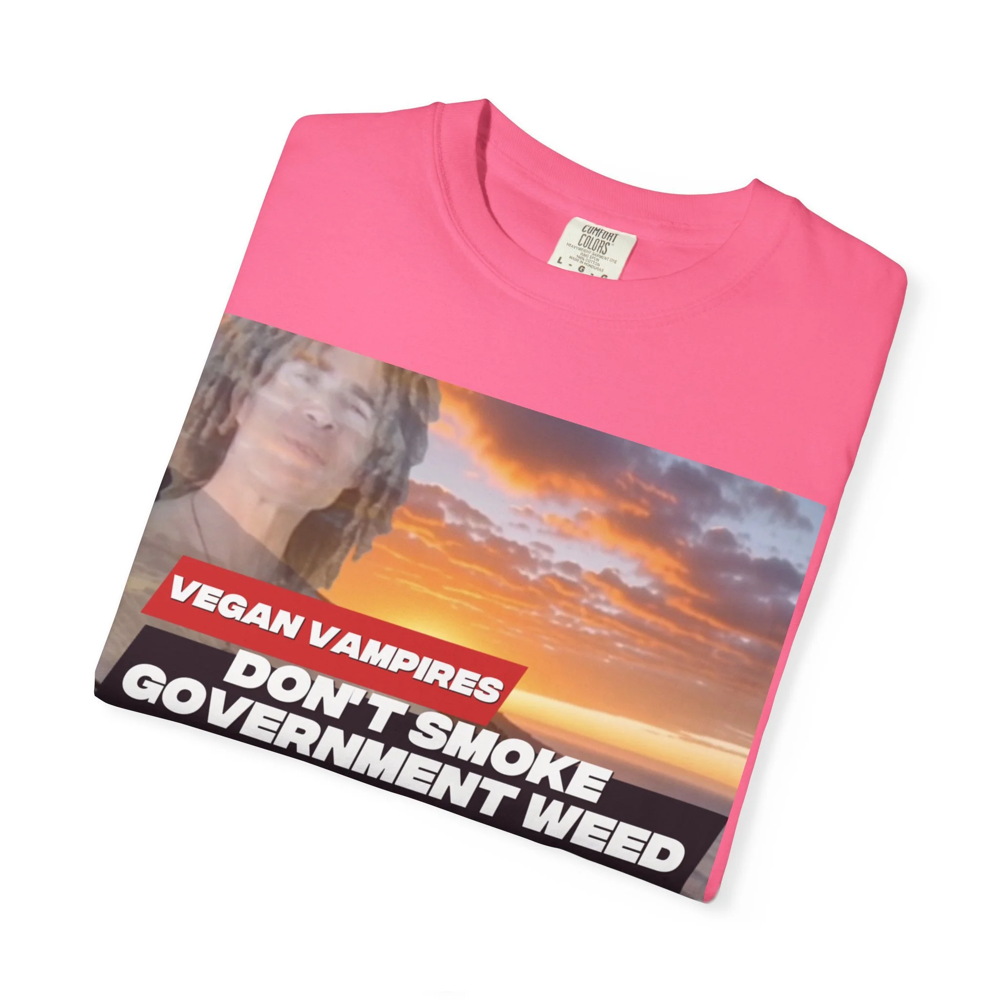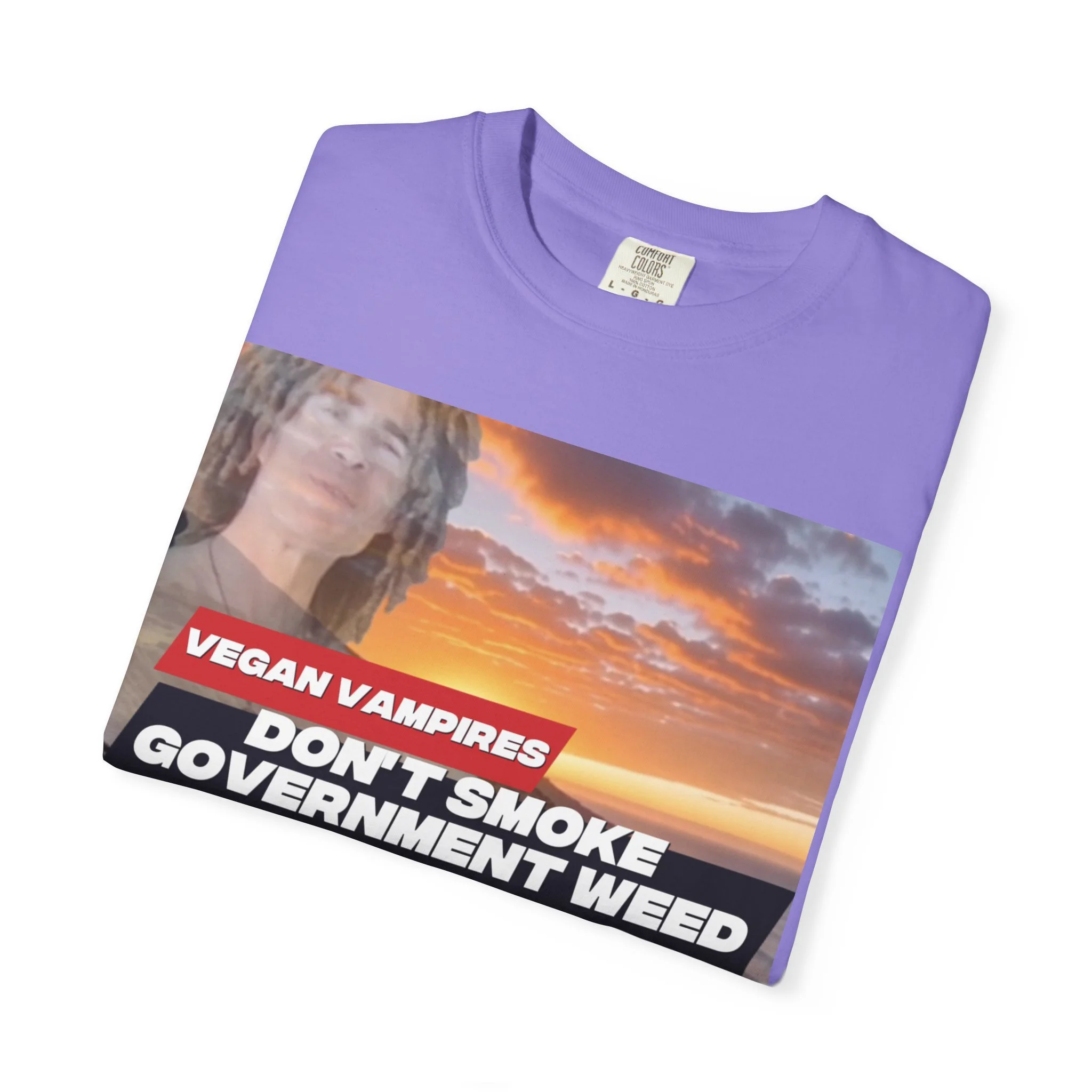 This heavyweight garment-dyed tee carries attitude and comfort in equal measure. The bold, retro-style graphic—bright red bar and white text over a confetti-like purple splash—reads like a rebellious slogan meant to be noticed. The relaxed fit and soft, washed-in color make it feel lived-in from day one. Wear it to late-night meetups, protest marches, small gatherings, or when you just want your opinion to be loud without sacrificing comfort. The stitched details and tubular knit give it a clean, timeless silhouette that pairs easily with jeans, layered flannels, or a worn-in jacket. It sits well in laid-back wardrobes and those who like their statements direct and a little edgy.