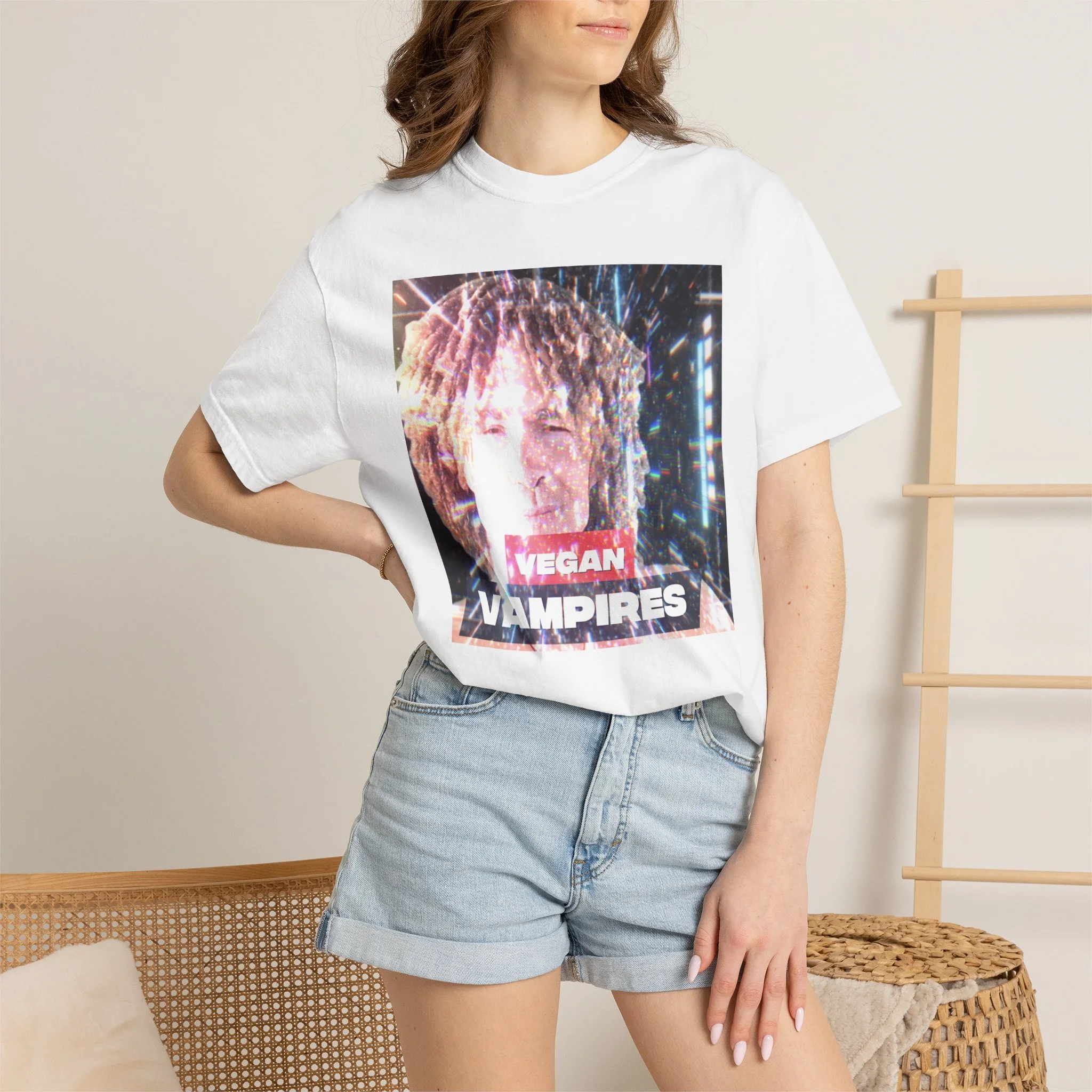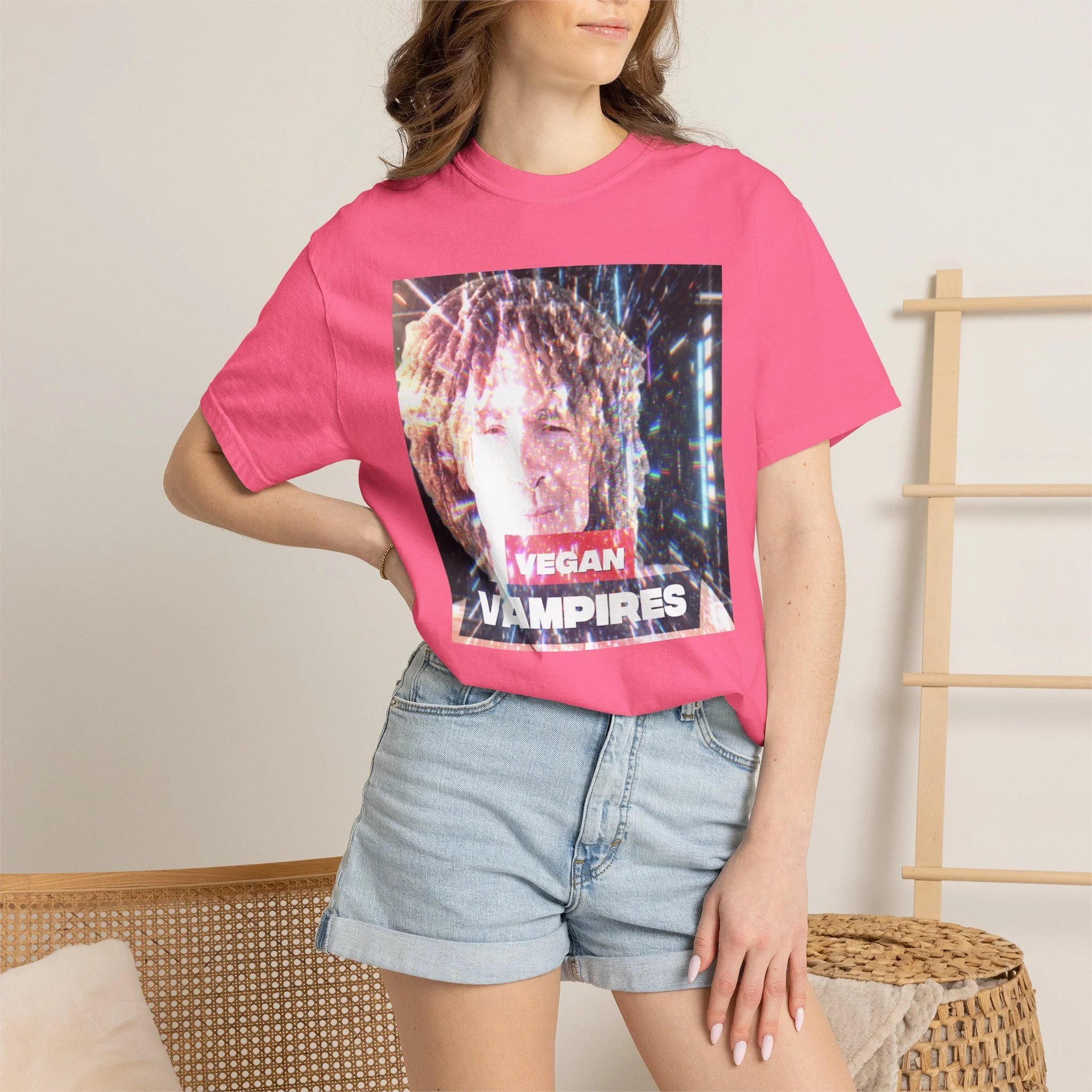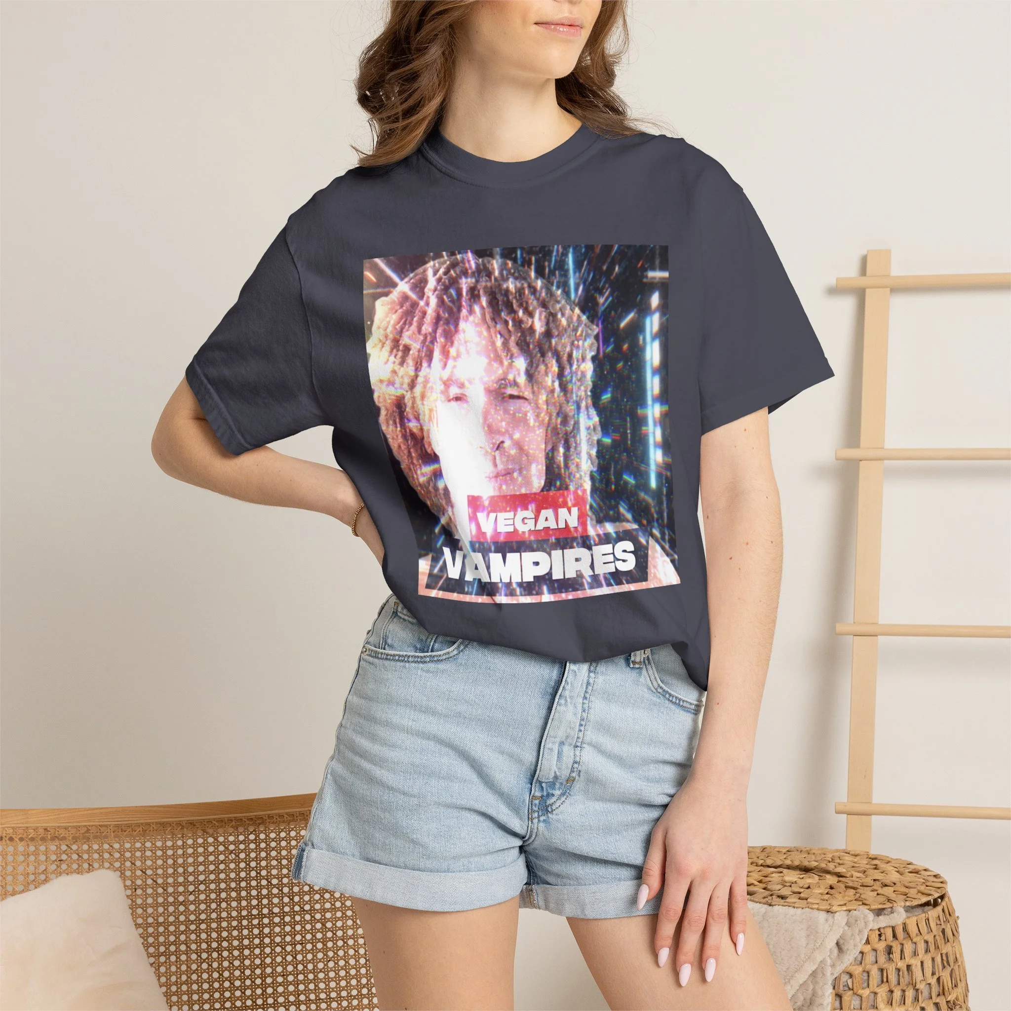 A heavyweight, garment-dyed tee with a grainy, retro-photo print that reads “Vegan Vampires.” The relaxed cut and soft, washed-in color give it a lived-in feel — like a band tee passed between friends at late-night shows. Wear it layered under a denim jacket for city nights or over a hoodie during cooler meetups. The subtle texture from the post-construction dyeing and the durable double-needle seams mean this shirt will age beautifully while keeping its vintage attitude. It’s for folks who collect offbeat statements and quiet rebellion in their wardrobe.