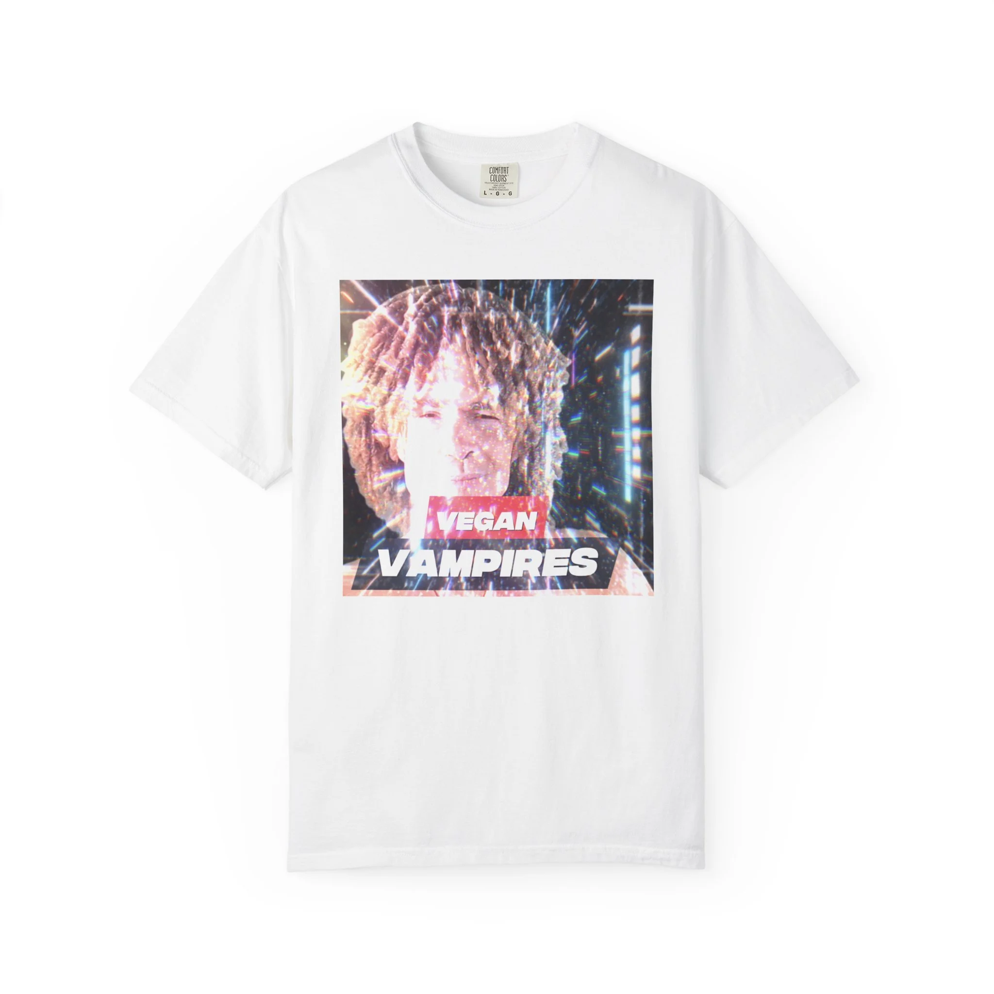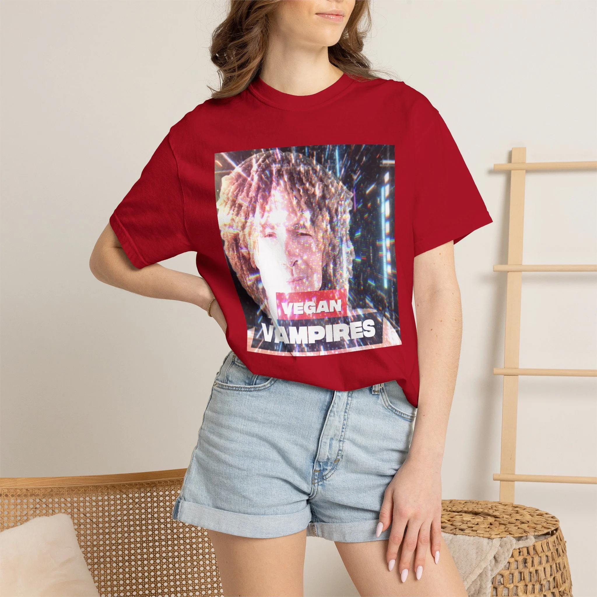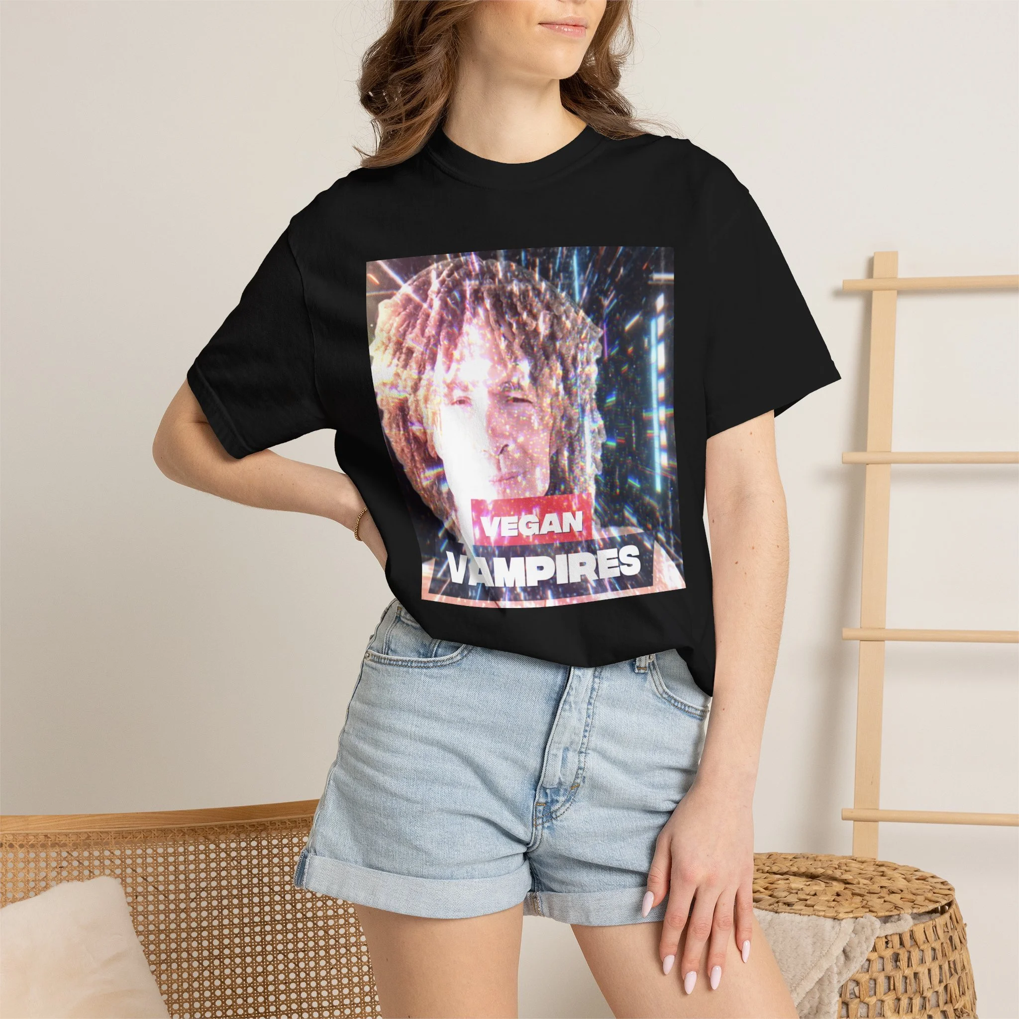 A heavyweight, garment-dyed tee with a grainy, retro-photo print that reads “Vegan Vampires.” The relaxed cut and soft, washed-in color give it a lived-in feel — like a band tee passed between friends at late-night shows. Wear it layered under a denim jacket for city nights or over a hoodie during cooler meetups. The subtle texture from the post-construction dyeing and the durable double-needle seams mean this shirt will age beautifully while keeping its vintage attitude. It’s for folks who collect offbeat statements and quiet rebellion in their wardrobe.